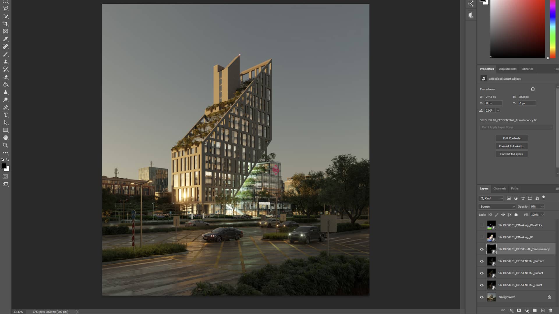 Lighting plays a versatile role in presenting architecture through digital media. The unusual design of the building urged us to do something different with it. So, in collaboration with the architect, we started searching for sunset/golden hour lighting on the internet so we could translate that into our renders.