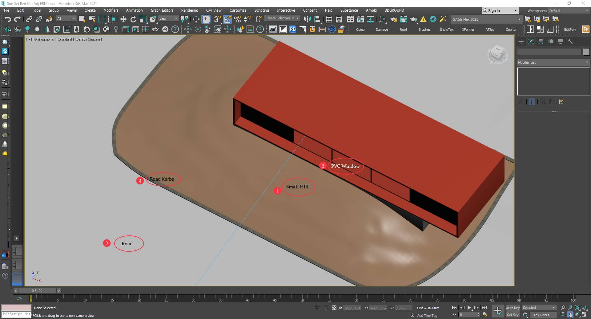 The road was created with a subdivided plane, sculpted using brush tools, while kerbstones were modeled using splines, detach, and chamfer tools for precision.