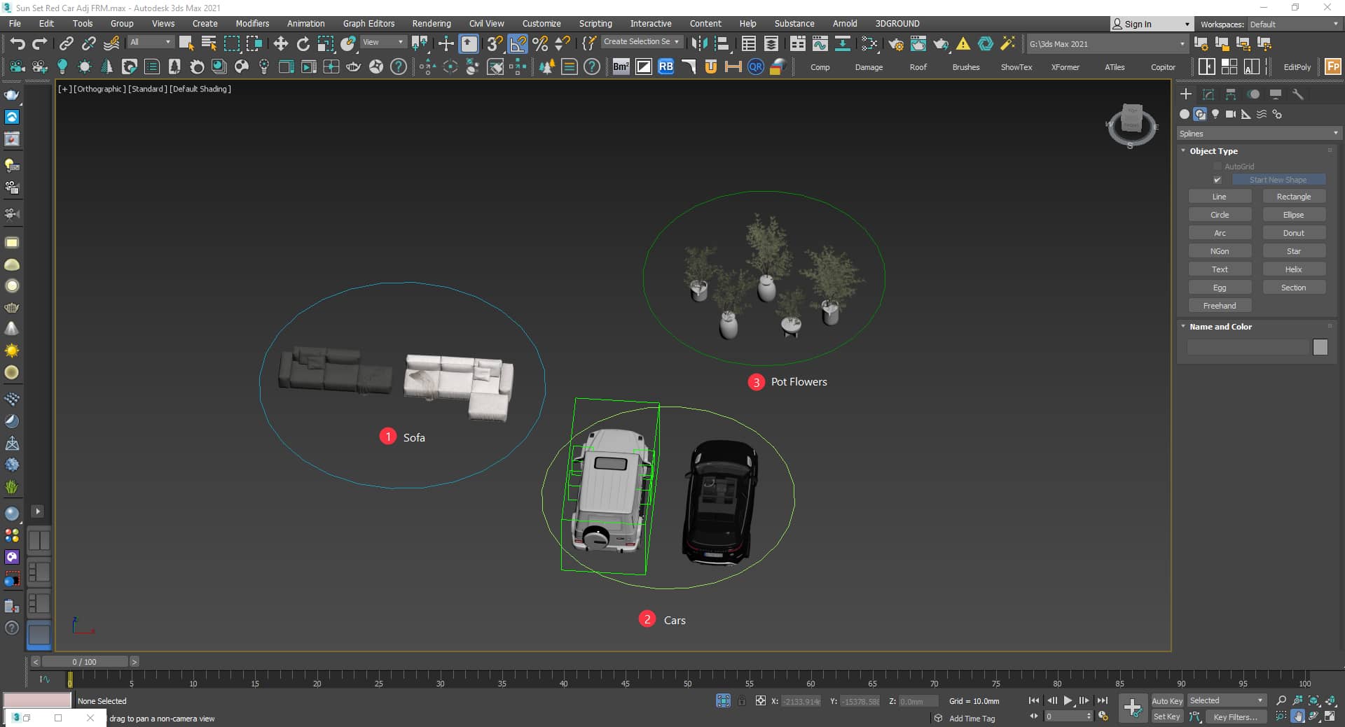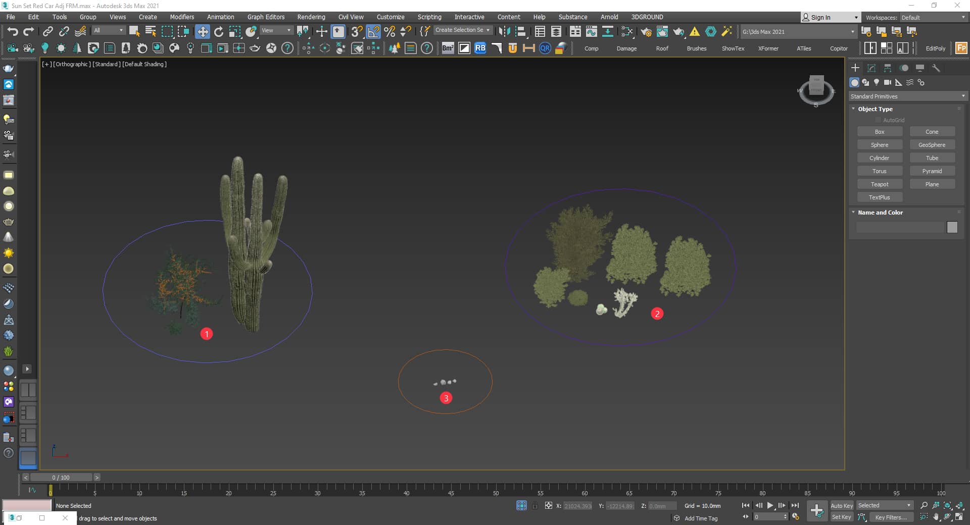 Shrubs were scattered with Forest Pack, while wild grass was distributed using Chaos Scatter.