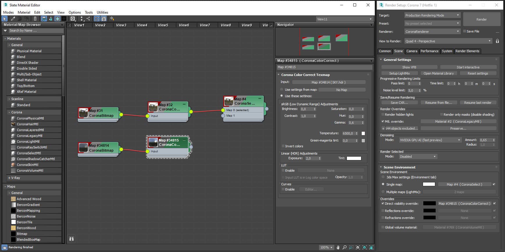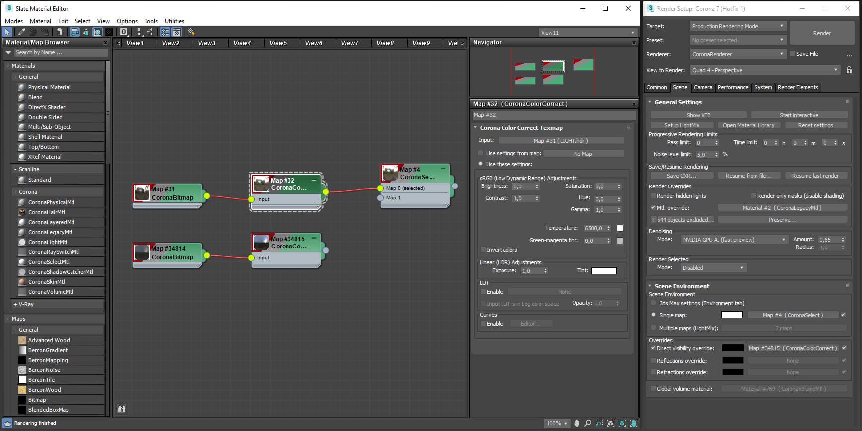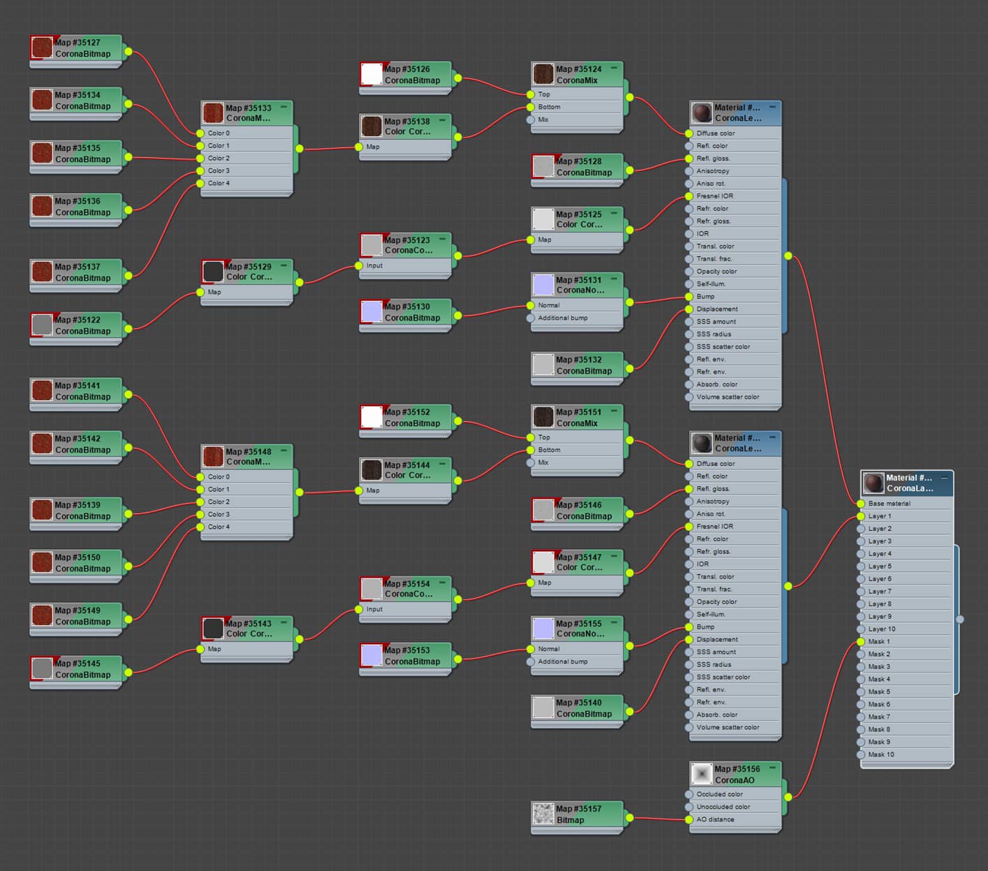 I used mostly Quixel Megascans materials in this project, so I won't go into too much detail about that since I didn't create any new materials. To create a more complex material, I mixed some materials through a b/w map using CoronaLayeredMtl. I will show you some of the materials below: