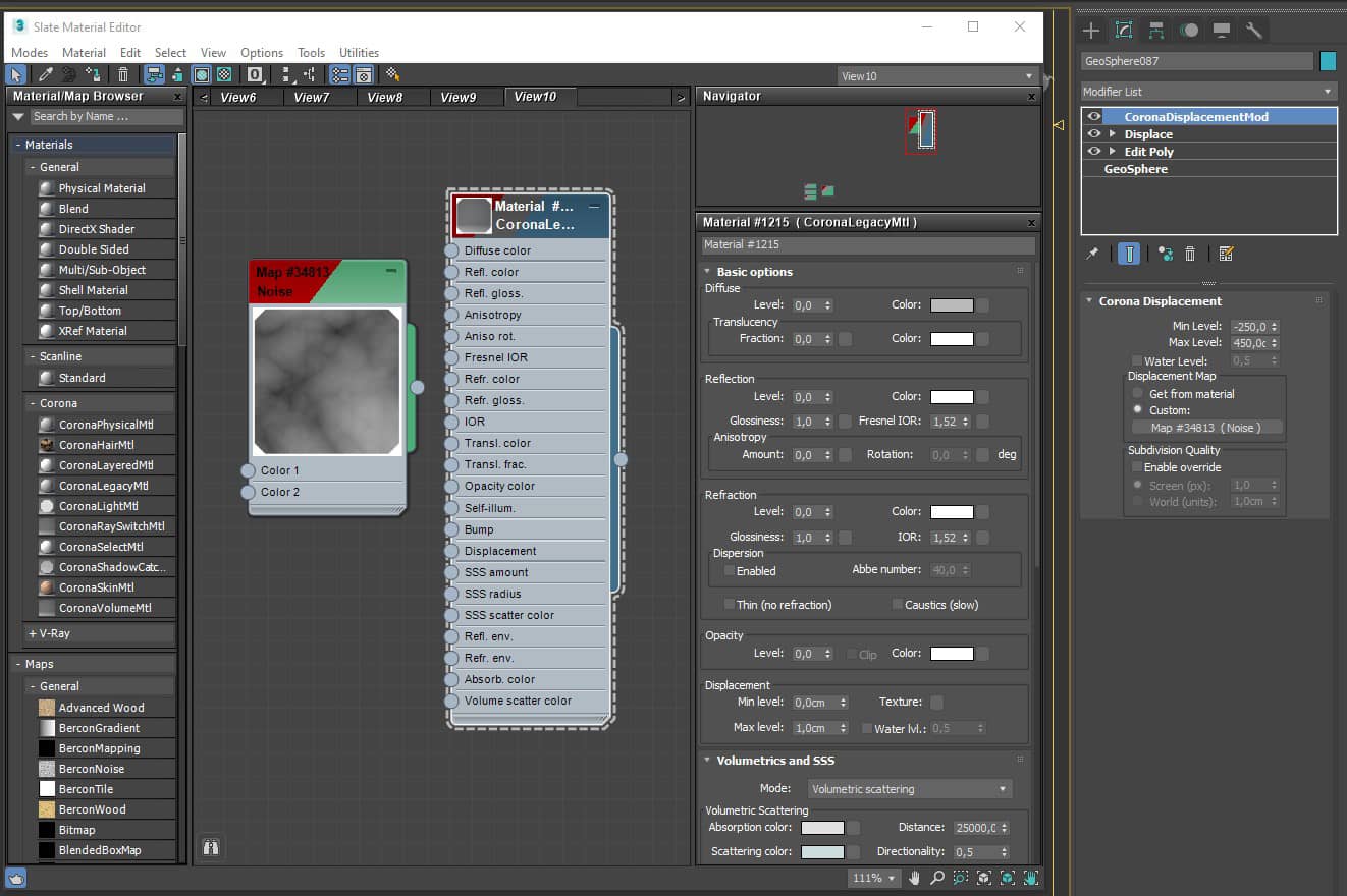 Using the Paint Deform tool on the Ribbon tab, I distorted the geosphere geometry. After that, using the Displace modifier and Noise Map, I gave the geometry a cloudy shape.