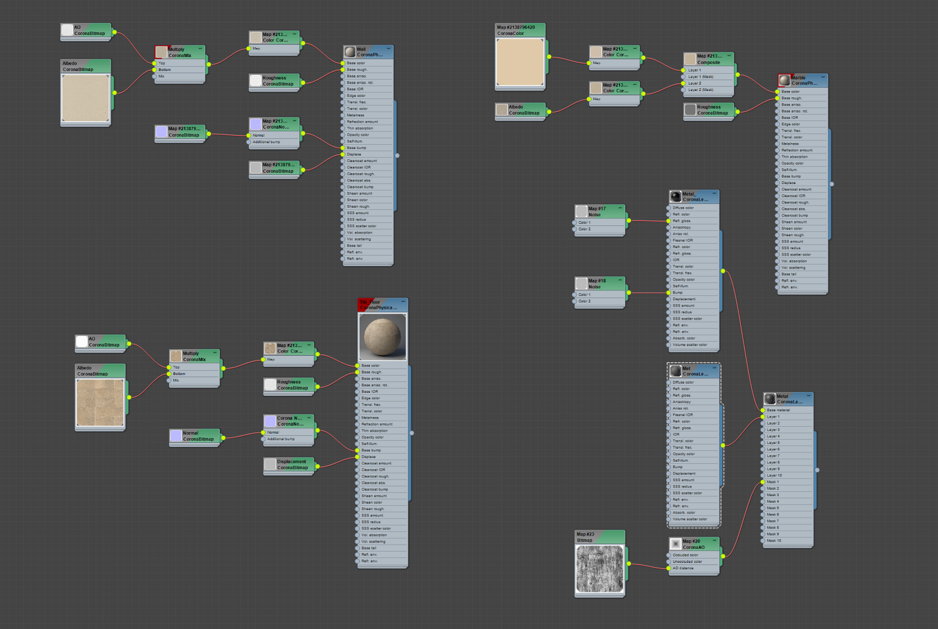The scene contains 4 main materials: Wall plaster, Tile floor, Marble steps, and Metal, all sourced from Quixel. The metal, however, was a Corona-layered material that was made with a dirt mask added.